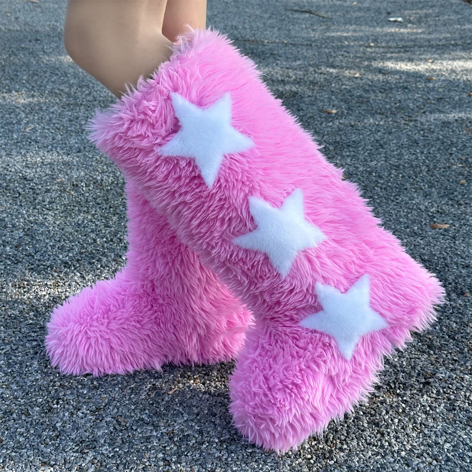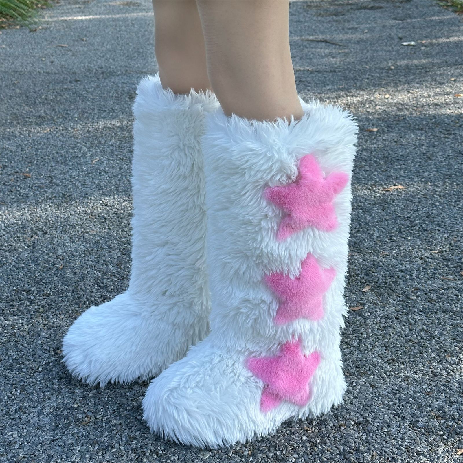 Plush Mid-Calf Thermal Round Toe Snow Boots, Flat Heel All-Season Korean/ Style Footwear (White Star Patterns, PU Sole) for Casual & Cold Weather.